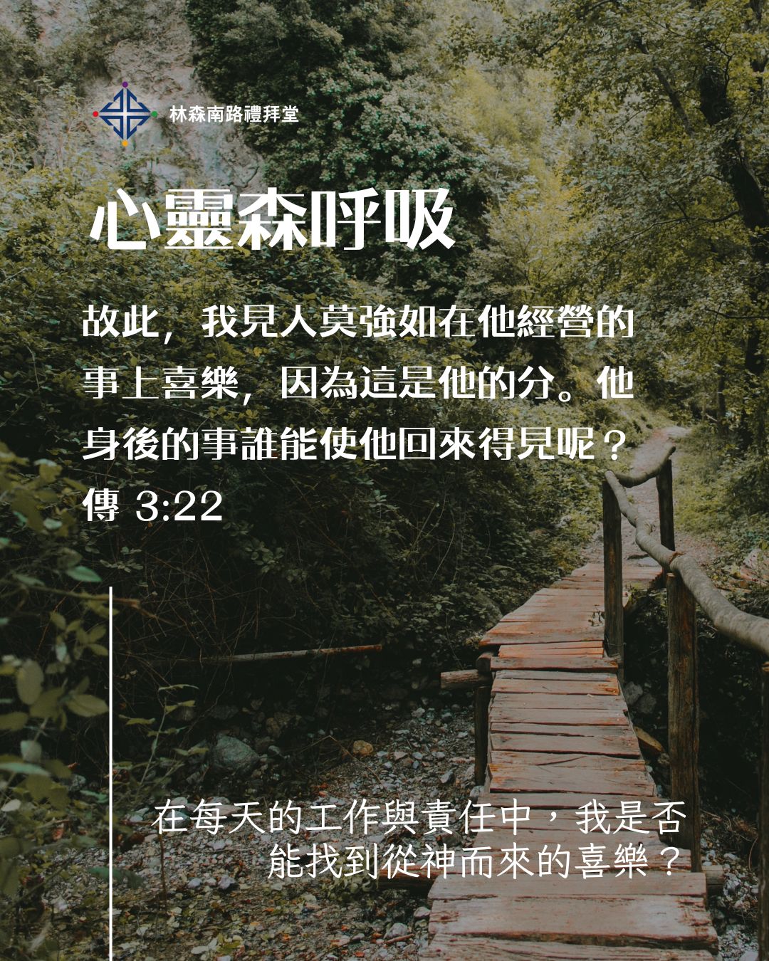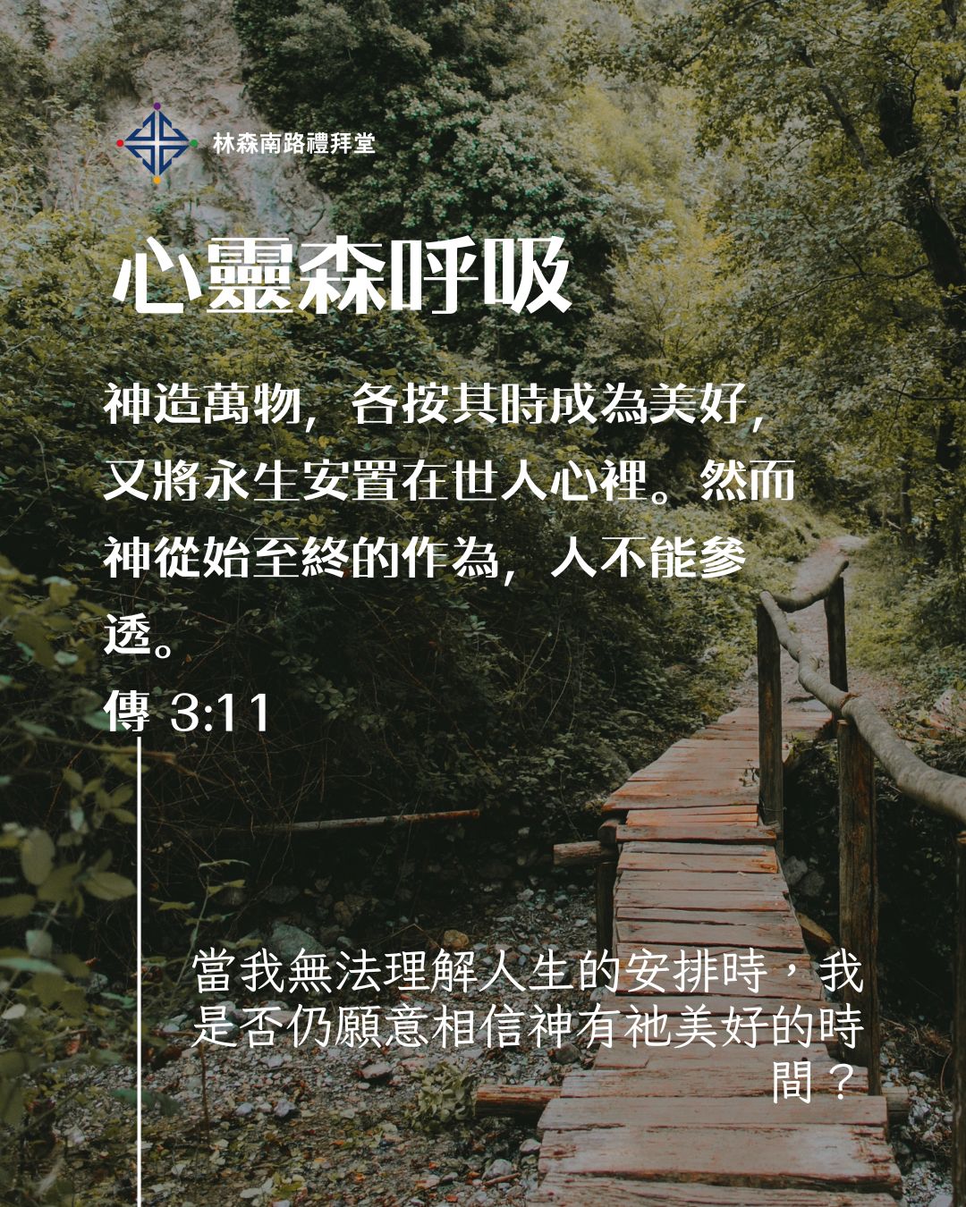 4. 疫情中能有盼望嗎? 為什麼? 11 神造萬物,各按其時成為美好,又將永生(原文是永遠)安置在世人心裡。然而神從始至終的作為,人不能參透。 12 我知道世人,莫強如終身喜樂行善; 13 並且人人吃喝,在他一切勞碌中享福,這也是神的恩賜。 14 我知道神一切所作的都必永存;無所增添,無所減少。神這樣行,是要人在他面前存敬畏的心。 15 現今的事早先就有了,將來的事早已也有了,並且神使已過的事重新再來(或譯:並且神再尋回已過的事)。 3:11“神造萬物,各按其時成為美好”起初神創造天地,六日內依序造了光,空氣,青草,菜蔬,樹木,日月眾星,大魚,飛鳥,野獸,牲畜,昆蟲,神看著是好的,最後[創世記 1:27]“神就照著自己的形像造人,乃是照著他的形像造男造女。”[創世記 2:7]“耶和華神用地上的塵土造人,將生氣吹在他鼻孔裡,他就成了有靈的活人,名叫亞當。”只有人是照著神的形像造的,並且領受了神的生氣,成了有靈的活人,所以我們心裡有“永恆”的認知.都是神所賜的,但是我們生活在有限的時空當中,若非神的啟示,我們無法完全了解神的作為. 以賽亞書 55:9“天怎樣高過地,照樣,我的道路高過你們的道路;我的意念高過你們的意念。”感謝主,雖然我們不能參透神的作為,神的啟示在聖經裡都已經完全了. 3:12-13世人喜樂行善,也知道一切勞碌所得,都是神的恩賜.傳道書多次談到享受勞碌所得的分,是神的賞賜(2:21-24),但是如果目光只放在今生的行善和報償,看見自己勞碌所得被鄰舍嫉妒,或成為別人的快樂,難免會落入虛空,捕風的迷惘裡. 3:14神在永恆裡為每個人的計劃與作為,主權在祂,我們應存敬畏的心,順服神的旨意. 箴言 9:10“敬畏耶和華是智慧的開端;認識至聖者便是聰明。”羅馬書 12:2“不要效法這個世界,只要心意更新而變化,叫你們察驗何為神的善良、純全、可喜悅的旨意。” 希伯來書 10:36“你們必須忍耐,使你們行完了神的旨意,就可以得著所應許的。” 3:15 回應了傳道書 1:9-11“9已有的事後必再有;已行的事後必再行。日光之下並無新事。10豈有一件事人能指著說這是新的﹖哪知,在我們以前的世代早已有了。11已過的世代,無人記念;將來的世代,後來的人也不記念。”也再度感嘆“凡事都有定期”,日光之下萬物週而復始地發生,若能鑑往知來,數算自己的日子,就能“得著智慧的心”了(詩篇90:12). 討論問題: 1. 為什麼人無法參透神的作為? 神如何啟示我們祂的作為? 2. “鑑往”就能“知來”嗎? 要如何才能有這樣的智慧? 16 我又見日光之下,在審判之處有奸惡,在公義之處也有奸惡。 17 我心裡說,神必審判義人和惡人;因為在那裡,各樣事務,一切工作,都有定時。 18 我心裡說,這乃為世人的緣故,是神要試驗他們,使他們覺得自己不過像獸一樣。 19 因為世人遭遇的,獸也遭遇,所遭遇的都是一樣:這個怎樣死,那個也怎樣死,氣息都是一樣。人不能強於獸,都是虛空。