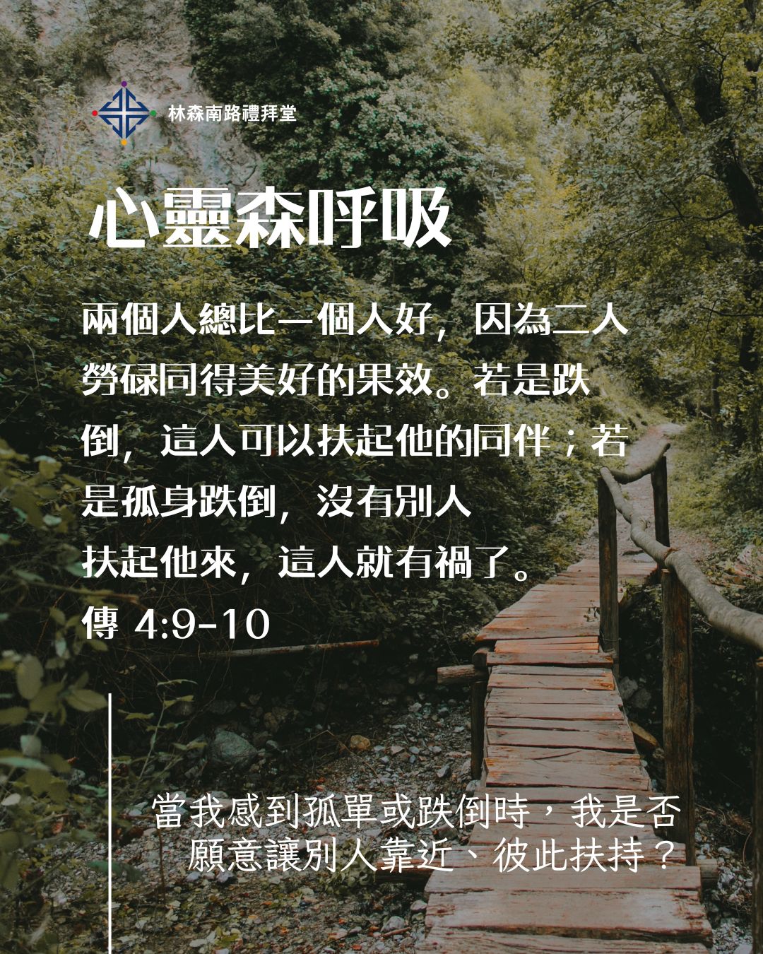 兩個人總比一個人好,……若是跌倒,這人可以扶起他的同伴。—傳道書4章9-10節