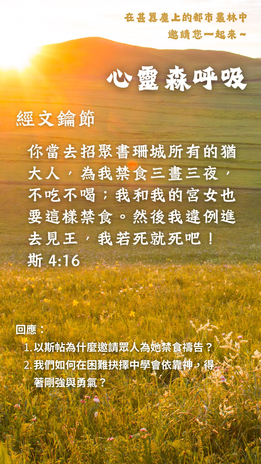 2. 鑰節:你當去招聚書珊城所有的猶大人,為我禁食三晝三夜,不吃不喝;我和我的宮女也要這樣禁食。然後我違例進去見王,我若死就死吧!(斯 4:16)