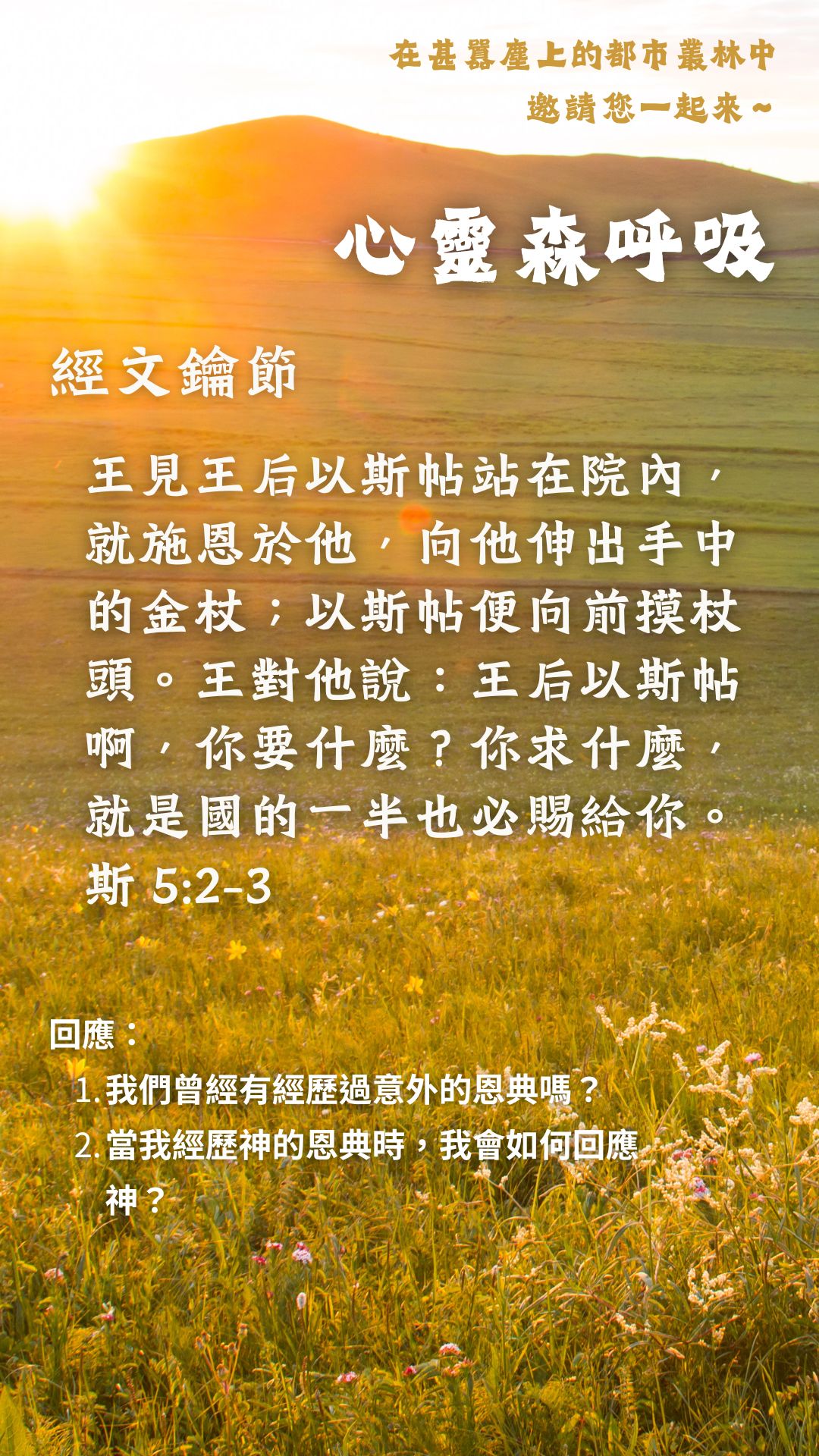 2. 鑰節:王見王后以斯帖站在院內,就施恩於他,向他伸出手中的金杖;以斯帖便向前摸杖頭。王對他說:王后以斯帖啊,你要什麼?你求什麼,就是國的一半也必賜給你。(斯 5:2-3)