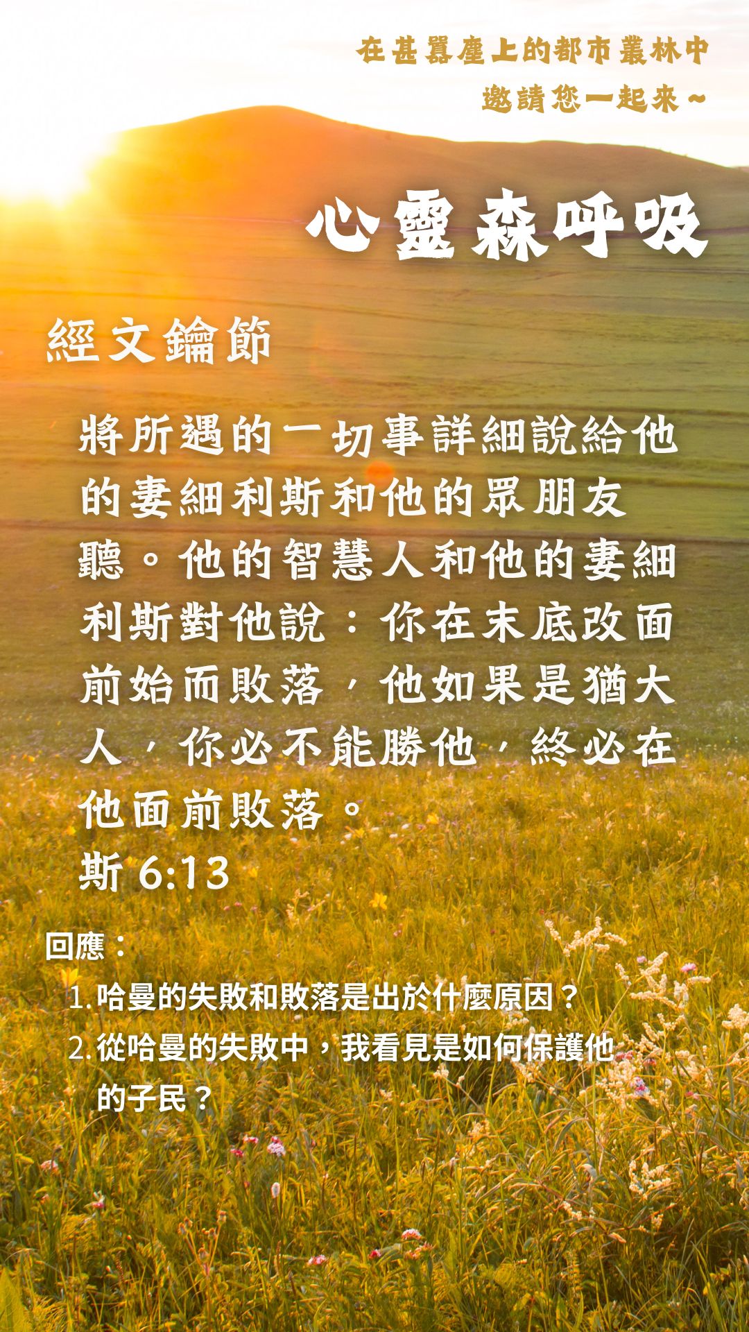 2. 鑰節:將所遇的一切事詳細說給他的妻細利斯和他的眾朋友聽。他的智慧人和他的妻細利斯對他說:你在末底改面前始而敗落,他如果是猶大人,你必不能勝他,終必在他面前敗落。(斯6:13)