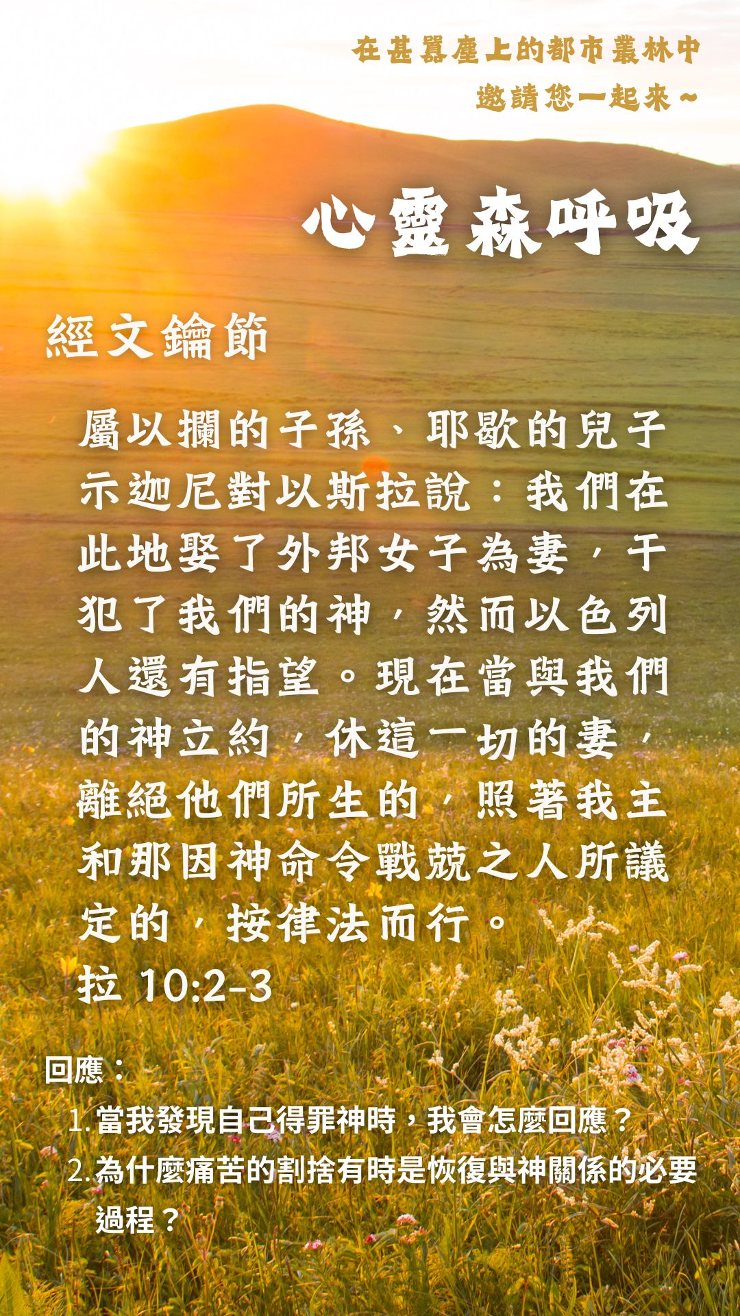 2. 鑰節:屬以攔的子孫、耶歇的兒子示迦尼對以斯拉說:我們在此地娶了外邦女子為妻,干犯了我們的神,然而以色列人還有指望。現在當與我們的神立約,休這一切的妻,離絕他們所生的,照著我主和那因神命令戰兢之人所議定的,按律法而行。(拉 10:2-3)