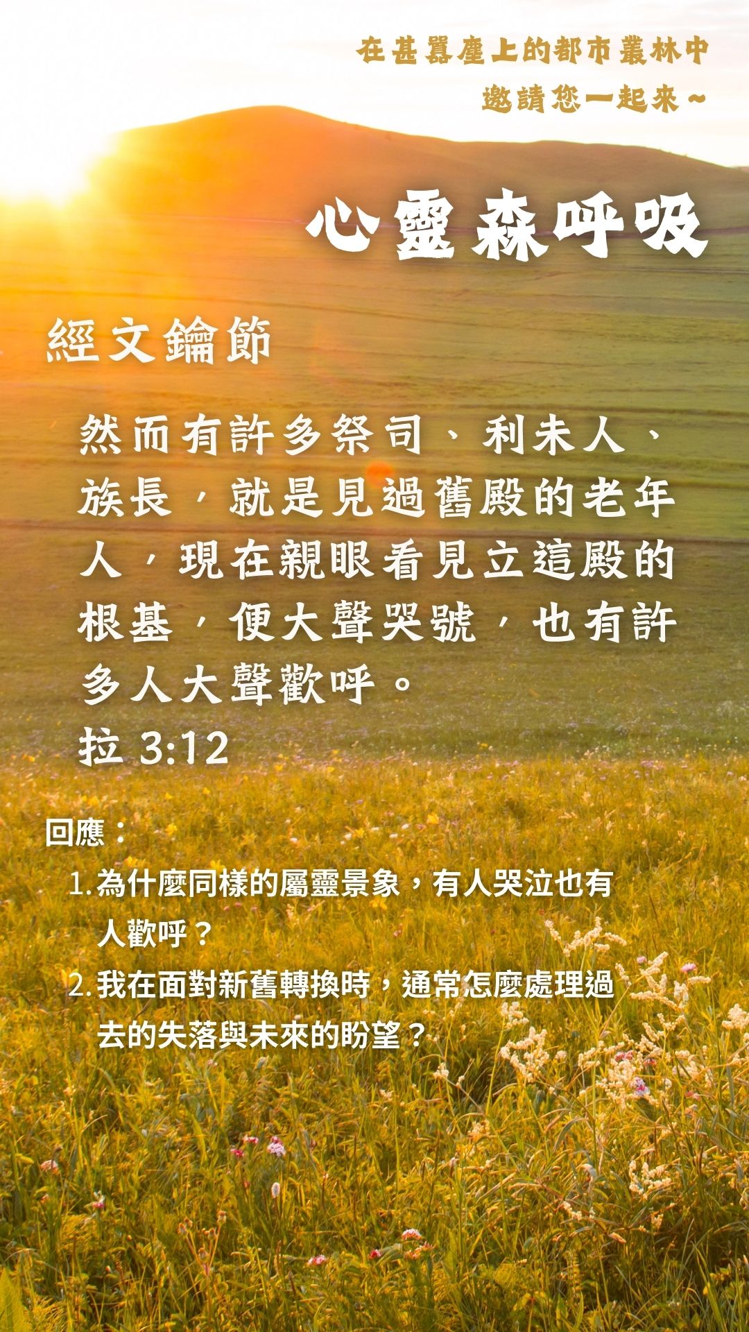 2. 鑰節:然而有許多祭司、利未人、族長,就是見過舊殿的老年人,現在親眼看見立這殿的根基,便大聲哭號,也有許多人大聲歡呼。(拉 3:12)