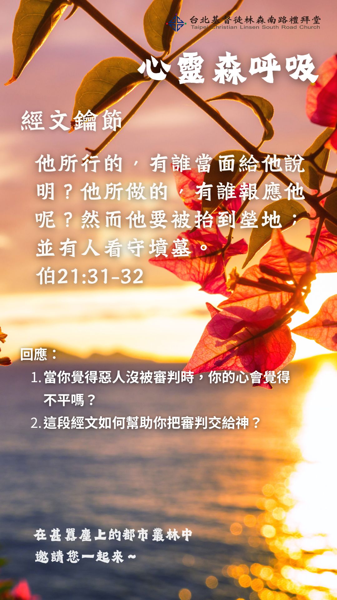 回應:從今天所讀的經文約略可體會約伯與這三位友人的差異之處。當約伯的友人對約伯說惡人不會亨通,約伯回答說:「他們的確會亨通!」,接著這些友人對約伯答辯說:「是會亨通,但不會太久!」,約伯回嗆說:「伯21:17惡人的燈何嘗熄滅?患難何嘗臨到他們呢?神何嘗發怒,向他們分散災禍呢?」;約伯這樣的說法顯然與「比勒達」曾經宣稱「伯18:5惡人的亮光必要熄滅,他的火焰必不照耀。」的看法,有很大出入;詩人在詩1:4也曾經說惡人就像糠秕被風吹散,對這看法約伯也質疑「伯21:18他們何嘗像風前的碎秸,如暴風刮去的糠秕呢?」。至於惡人遭報所受的刑罰會延遲,這些友人很可能又會換個說法說,若惡人未受到神的懲罰,那他們的兒女肯定會替他們父母親的罪受報(伯5:4他的兒女遠離穩妥的地步,在城門口被壓,並無人搭救。);約伯認為這樣的說法是不正確的,若是如此只會更加鼓勵惡人作惡,當他們犯罪,他們的兒女會代替受報應,這根本就是一個歪理。約伯認為只有當惡人親身經歷自己敗亡,作為他們受懲罰的回應,這樣才是真正公平,而不是將這報應臨到下一代子女身上。