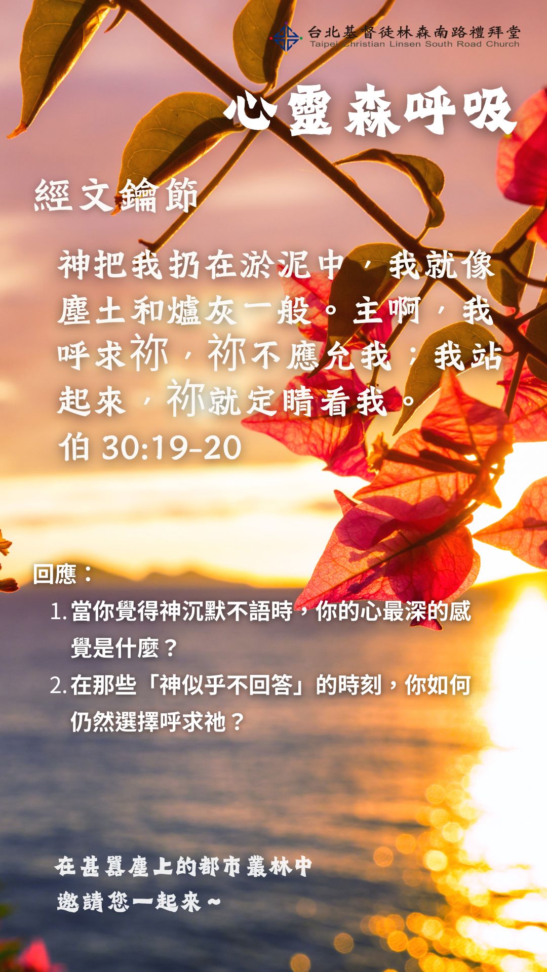2. 鑰節:神把我扔在淤泥中,我就像塵土和爐灰一般。主啊,我呼求祢,祢不應允我;我站起來,祢就定睛看我。(伯 30:19-20)