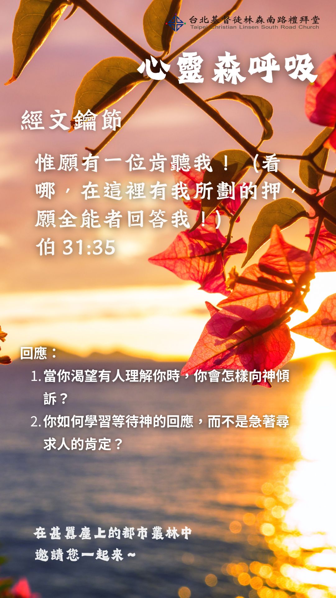 ■讀完本章,我的感受是什麼?我會感受到約伯是個怎樣的人?這麼嚴以律己還受到如此誤解,我可否感受到他的委屈之情?當我深覺委屈之際,請思想 31:35 裡我的「惟願」是什麼?我的「有一位」會是誰?