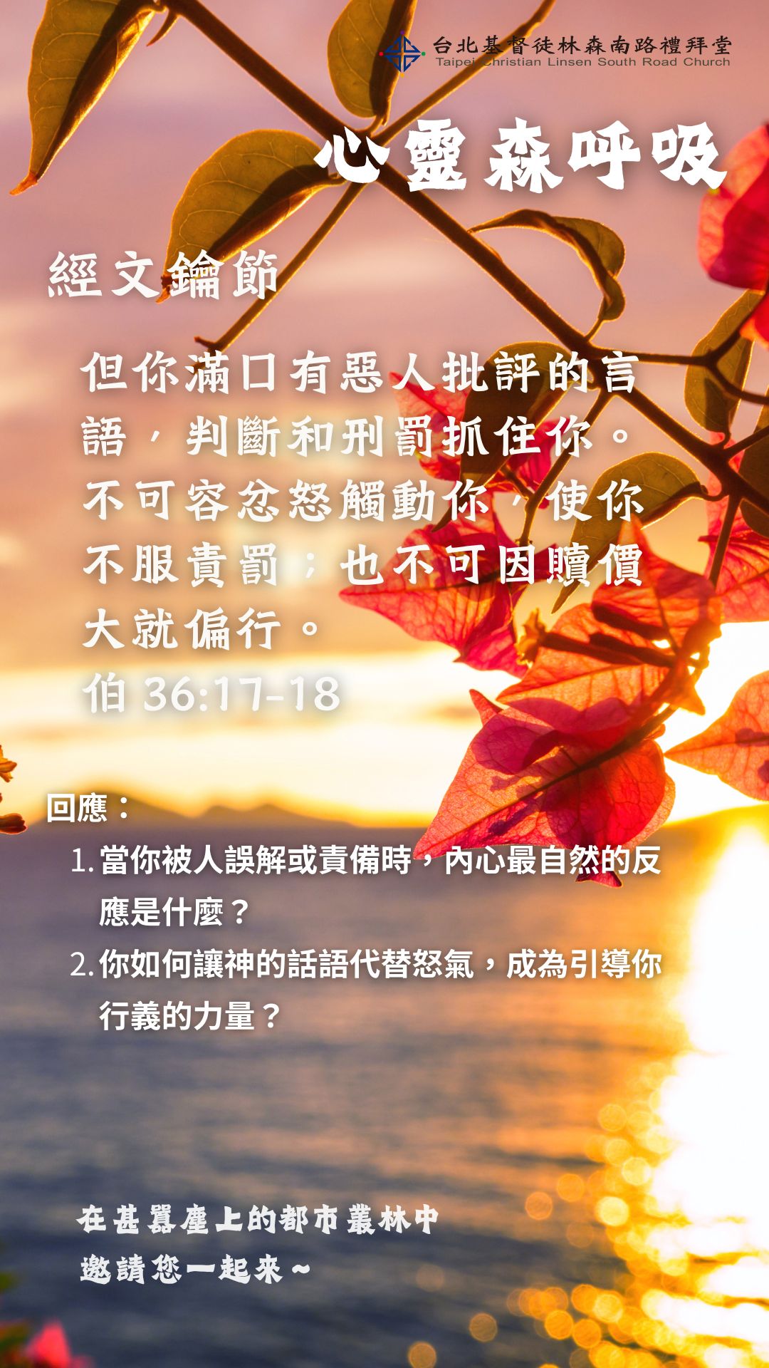 2. 鑰節:但你滿口有惡人批評的言語,判斷和刑罰抓住你。不可容忿怒觸動你,使你不服責罰;也不可因贖價大就偏行。(伯36:17-18)