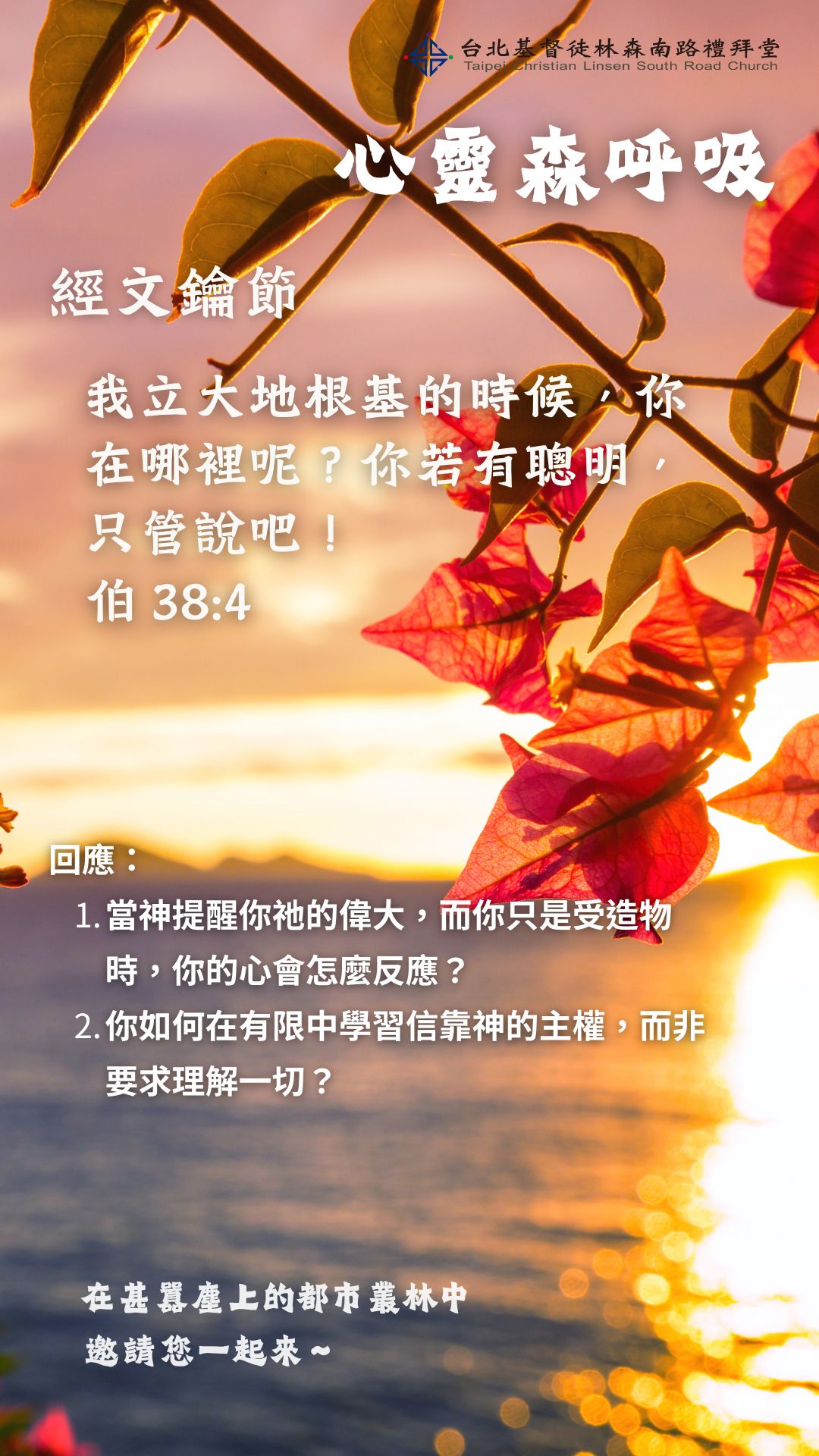 親愛的弟兄姊妹,神用大自然的現象與約伯對話,讓約伯知道神掌管這一切,這樣的情境不僅令約伯啞口無言,我們也是會同樣感受到神的作為真是不可思議;我們對神只能稱頌、讚美、降服敬畏外,其他的事我們一點都不能做,不是嗎?既然知道這位造天地萬物的主宰者是無所不能,那我們有什麼理由不去傳揚這位真神呢?求主幫助我們,在這末後的世代,讓我們勇敢站出來為主傳福音吧!(王牧師)