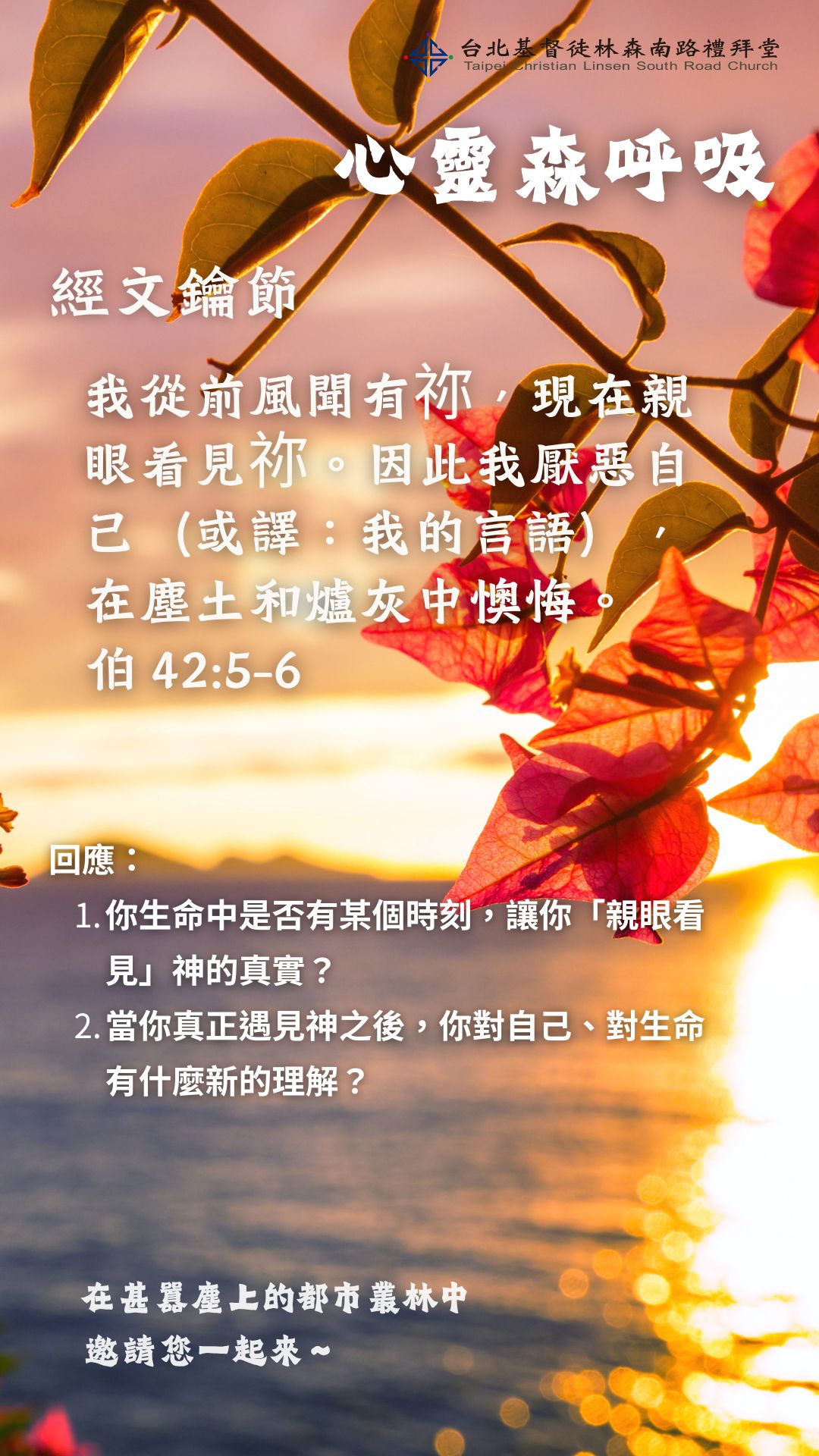 2. 鑰節:我從前風聞有祢,現在親眼看見祢。因此我厭惡自己(或譯:我的言語),在塵土和爐灰中懊悔。(伯 42:5-6)