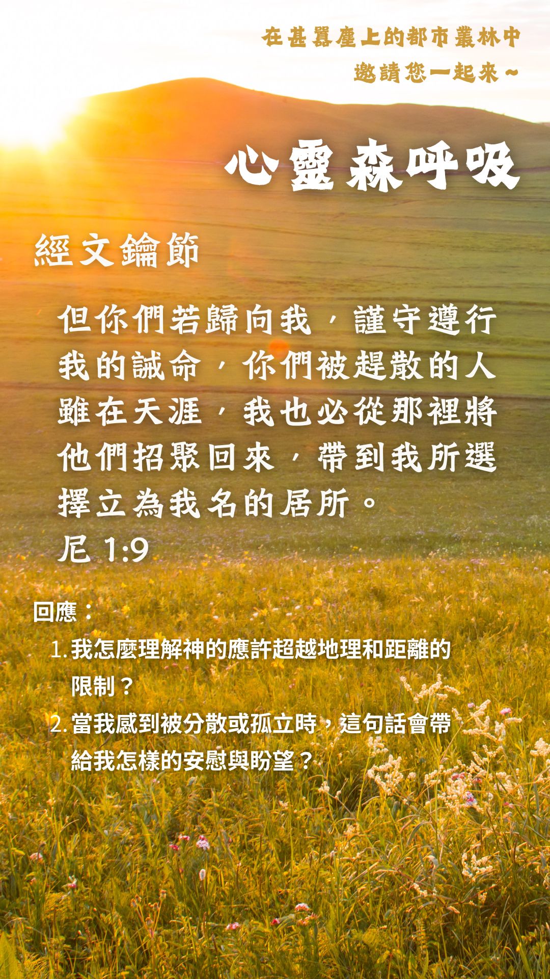 2. 鑰節:但你們若歸向我,謹守遵行我的誡命,你們被趕散的人雖在天涯,我也必從那裡將他們招聚回來,帶到我所選擇立為我名的居所。(尼 1:9)