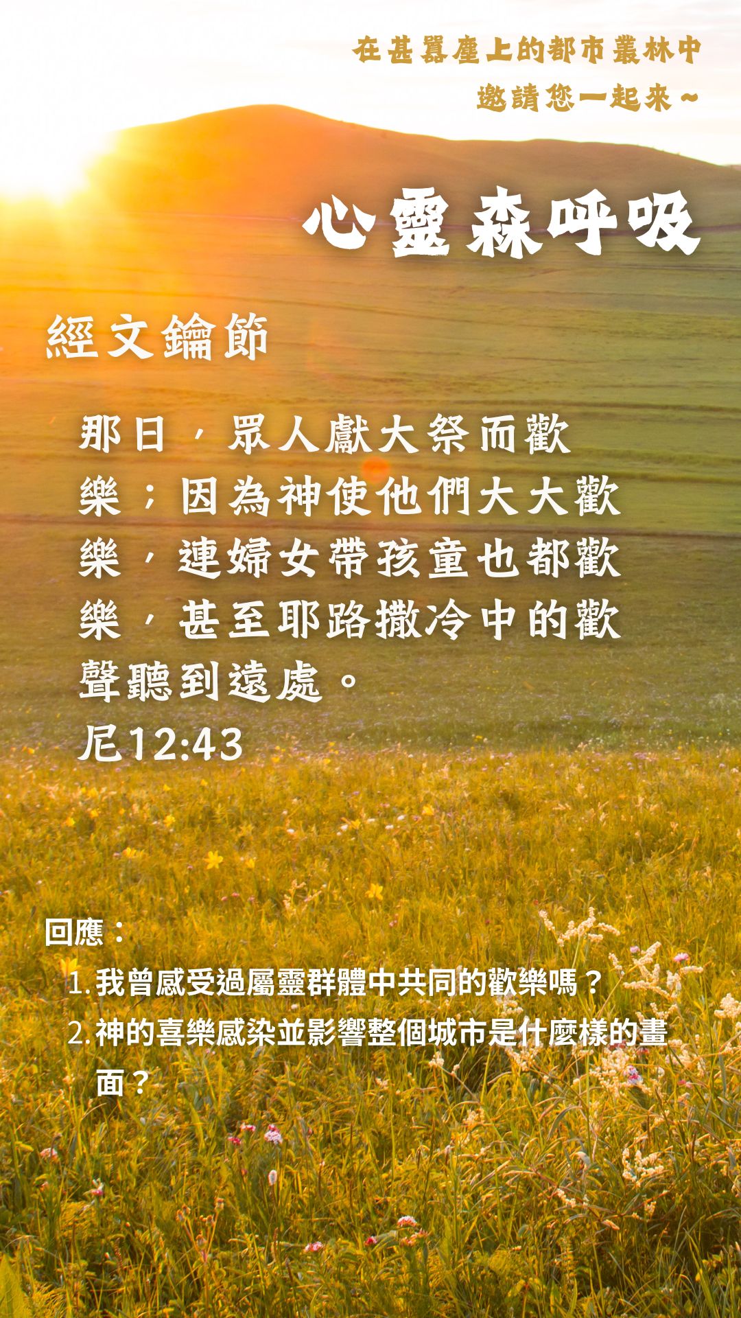 在耶路撒冷的城牆修築完成之後,百姓們舉行歡喜熱鬧的慶典,等於是完工奉獻的感恩禮拜。經文所描述的莊嚴典禮、歡樂氣氛,彷彿帶著我們置身在當時盛大的儀式,聽著祭司吹著號角、彈奏各樣樂器,耳中縈繞著利未人詩班高聲頌揚、敬拜上主的聖樂。