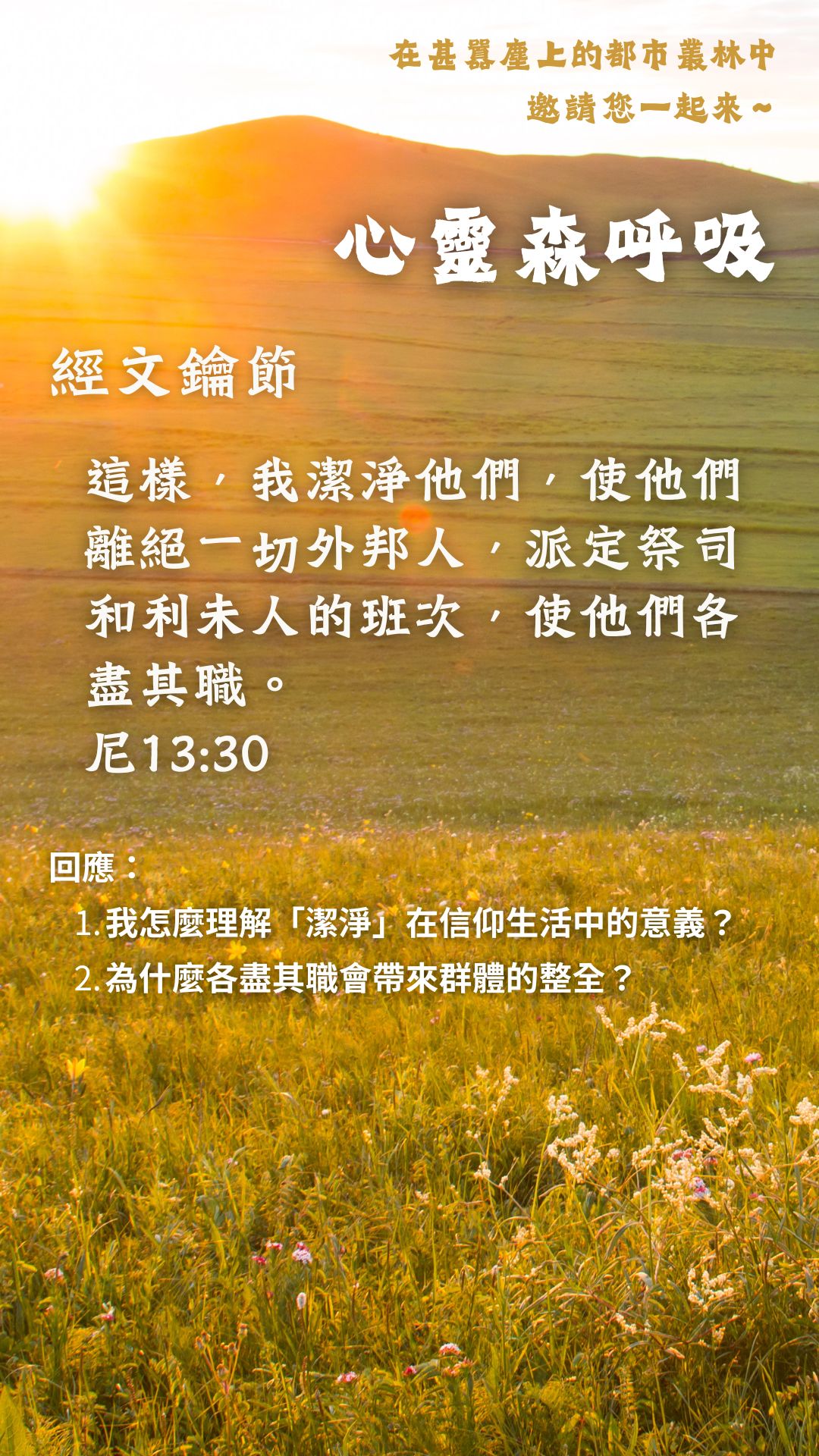 2. 鑰節:這樣,我潔淨他們,使他們離絕一切外邦人,派定祭司和利未人的班次,使他們各盡其職。(尼 13:30)