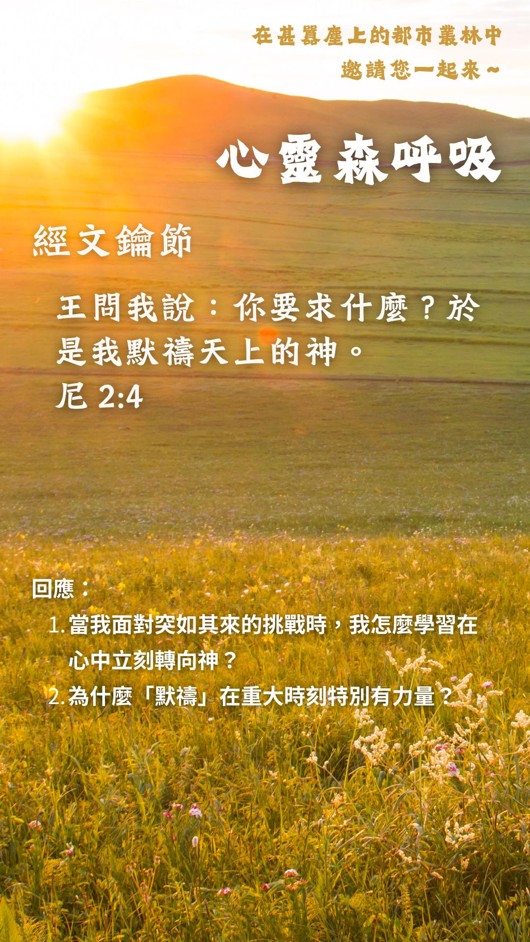 2. 鑰節:王問我說:你要求什麼?於是我默禱天上的神。(尼2:4)