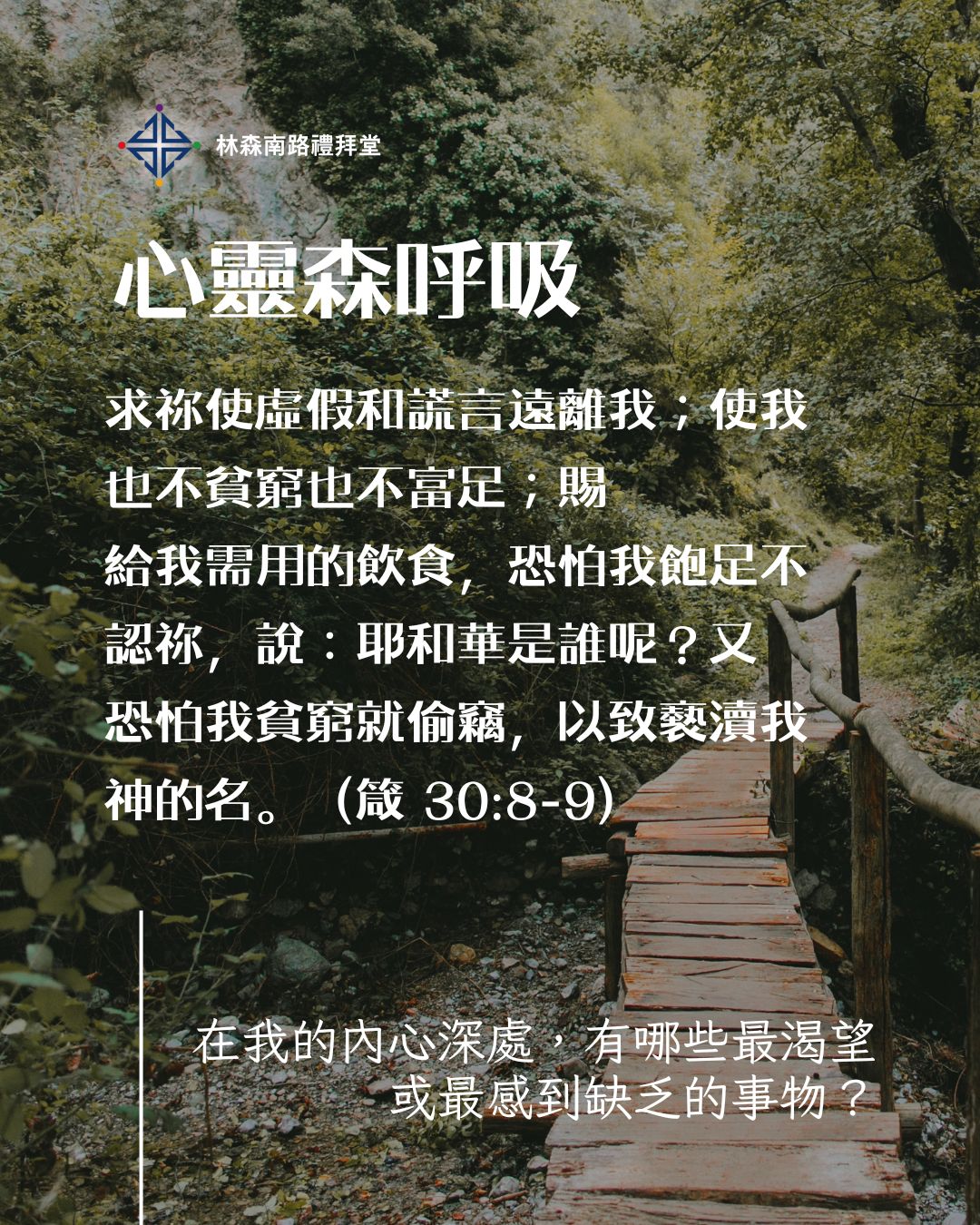 2. 鑰節:求祢使虛假和謊言遠離我;使我也不貧窮也不富足;賜給我需用的飲食,恐怕我飽足不認祢,說:耶和華是誰呢?又恐怕我貧窮就偷竊,以致褻瀆我神的名。(箴 30:8-9)