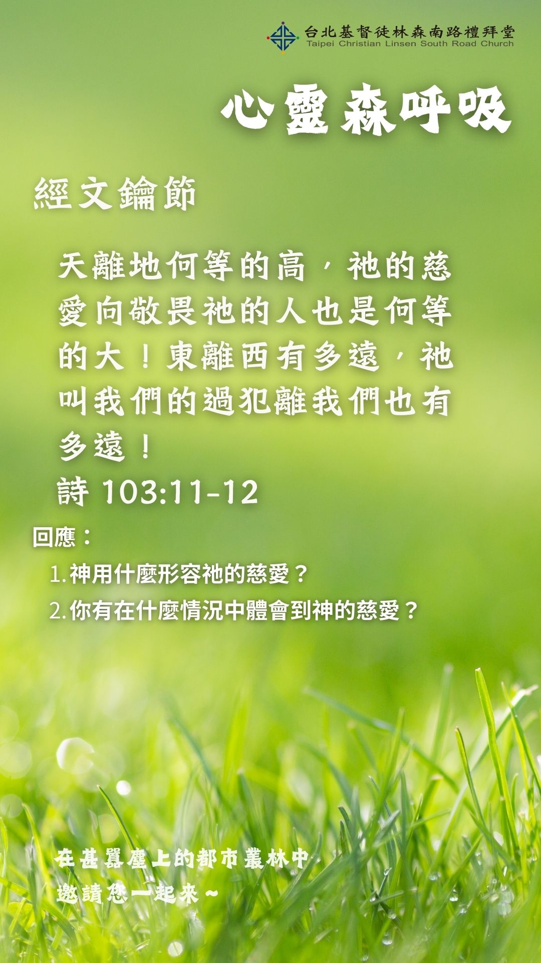 2. 鑰節:天離地何等的高,祂的慈愛向敬畏祂的人也是何等的大!東離西有多遠,祂叫我們的過犯離我們也有多遠!(詩103:11-12)
