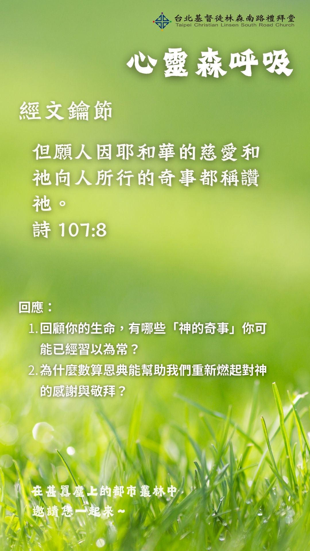 讓我們一起藉著這首詩,跟著詩人來數算神的恩典。為什麼我們當讚美神呢?詩人不斷地提到,因為我們「在苦難中哀求耶和華,祂從我們的禍患中拯救我們」(6、13、19、28節)。因著神在我們人生各樣的患難中,垂聽我們的哀求,拯救我們,因此,我們來稱謝祂!