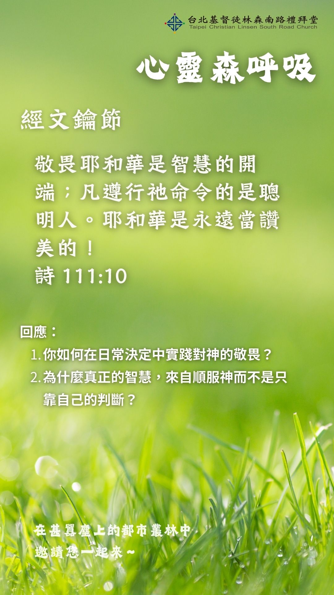 第5節及第10節詩人提到,因著神的作為是如此偉大奇妙,我們除了應當讚美祂之外,我們對神最大的回應就是:成為一個「敬畏神的人」!第10節讓我們看見,一個敬畏神的人是一個真正有智慧的人,敬畏神的人,行事必然有智慧!