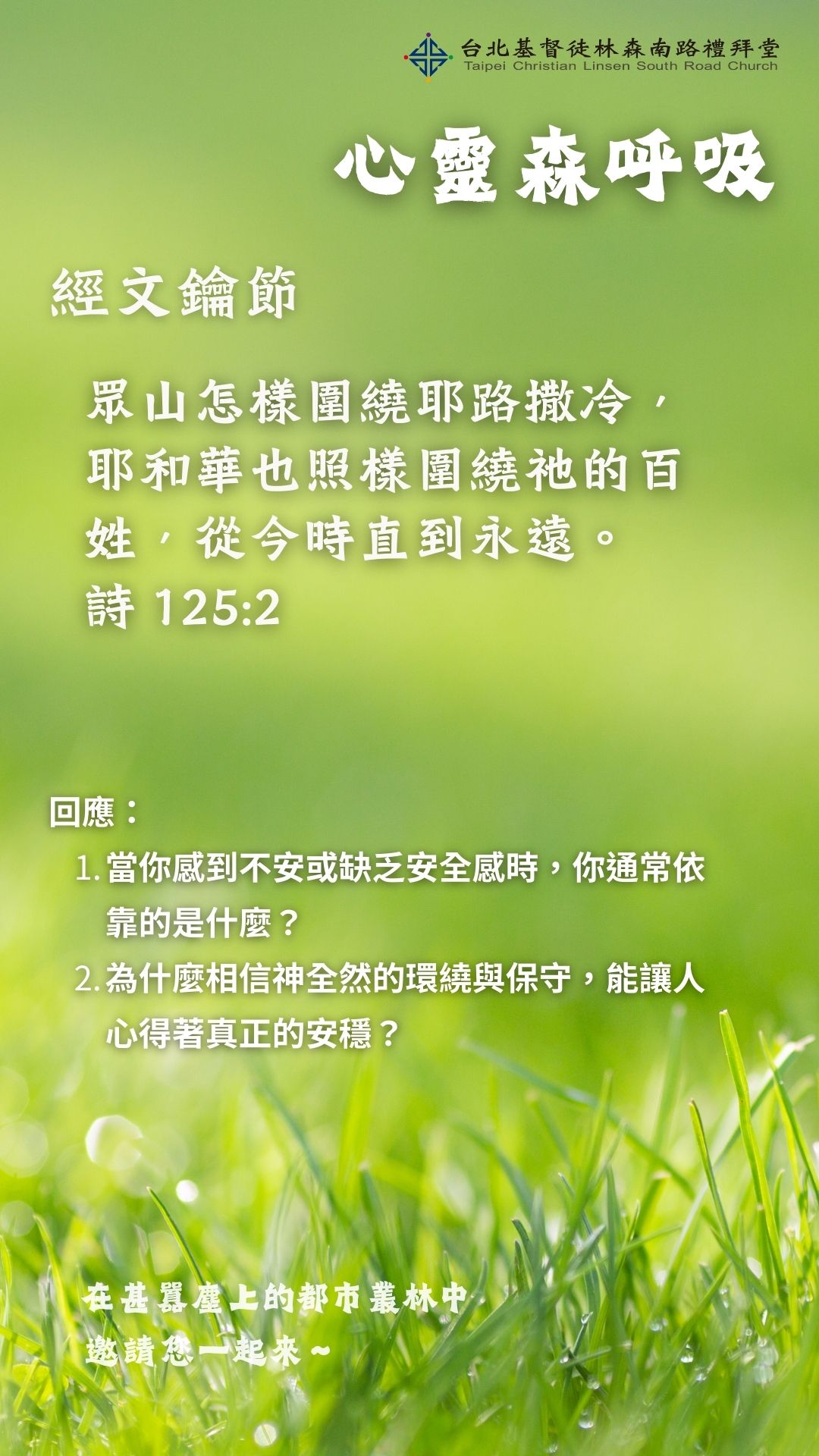 1~2節「倚靠耶和華的人好像錫安山,永不動搖。眾山怎樣圍繞耶路撒冷,耶和華也照樣圍繞他的百姓,從今時直到永遠。」