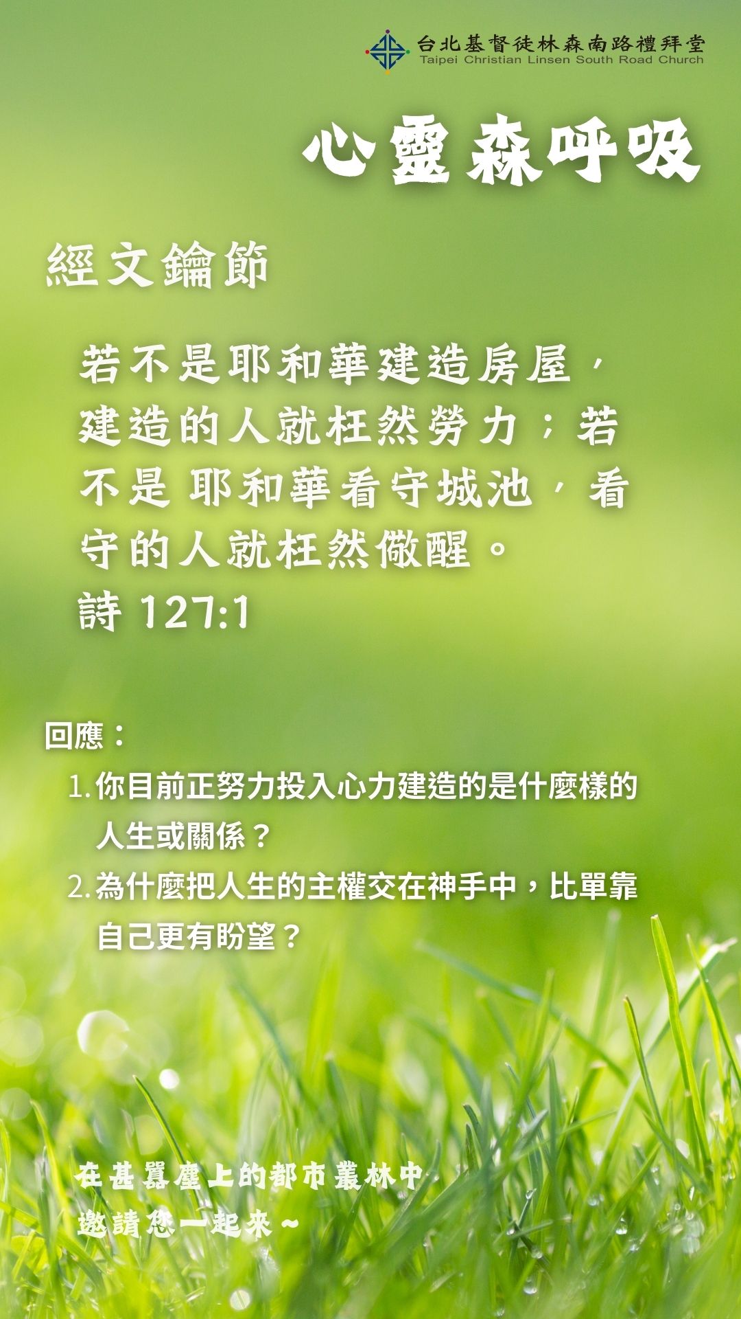 2. 鑰節 : 若不是耶和華建造房屋,建造的人就枉然勞力;若不是耶和華看守城池,看守的人就枉然儆醒。(詩 127:1)