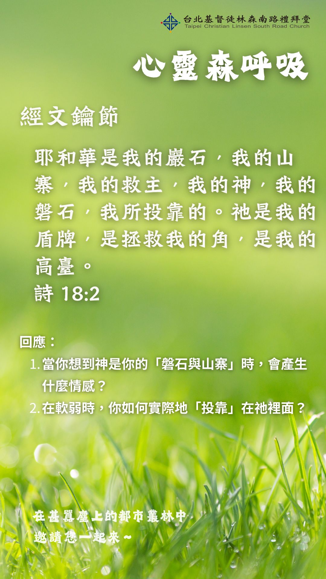 2. 鑰節:耶和華是我的巖石,我的山寨,我的救主,我的神,我的磐石,我所投靠的。祂是我的盾牌,是拯救我的角,是我的高臺。(詩 18:2)
