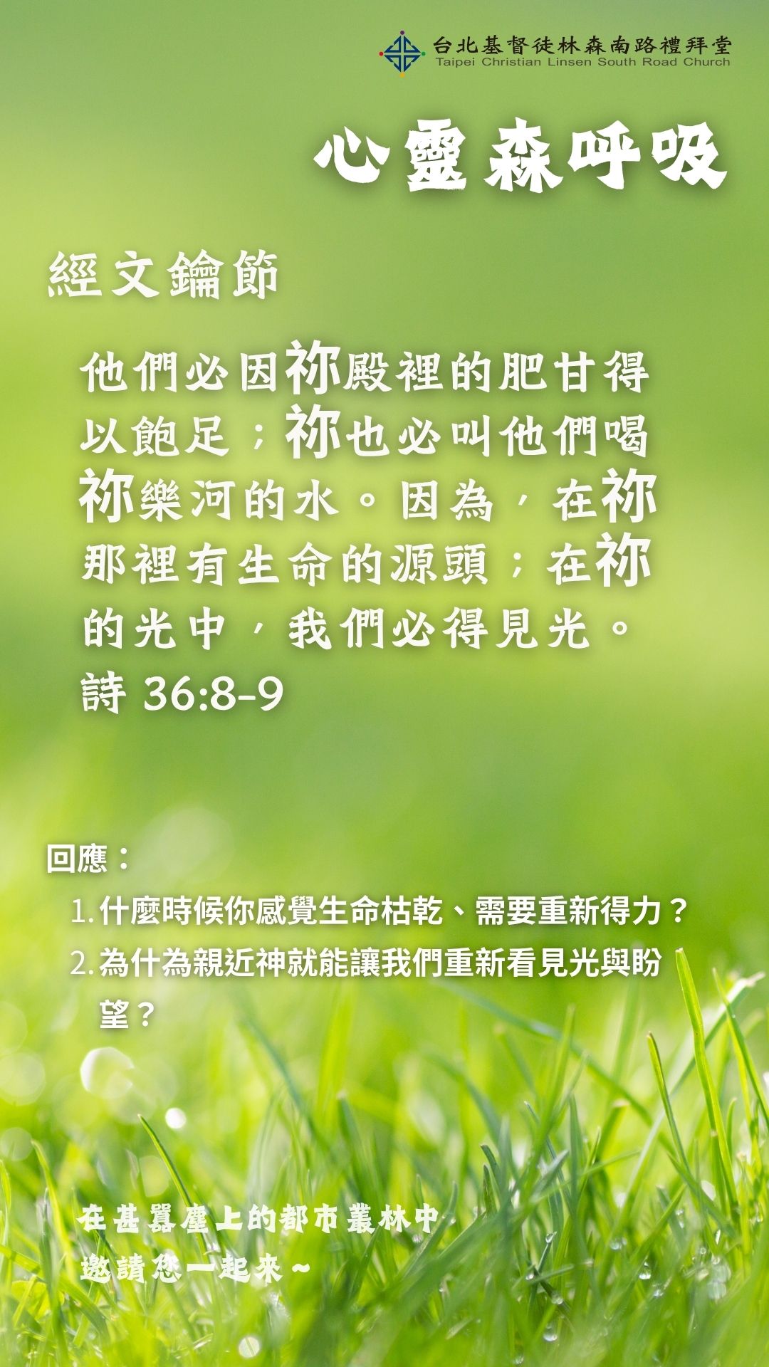 2. 鑰節:他們必因祢殿裡的肥甘得以飽足;祢也必叫他們喝祢樂河的水。因為,在祢那裡有生命的源頭;在祢的光中,我們必得見光。(詩 36:8-9)