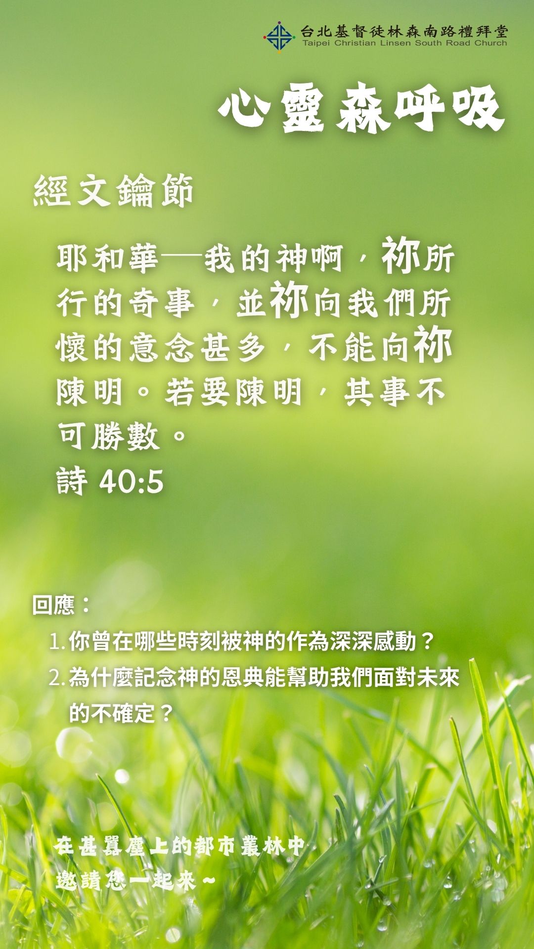 2. 鑰節:耶和華─我的神啊,祢所行的奇事,並祢向我們所懷的意念甚多,不能向祢陳明。若要陳明,其事不可勝數。(詩40:5)