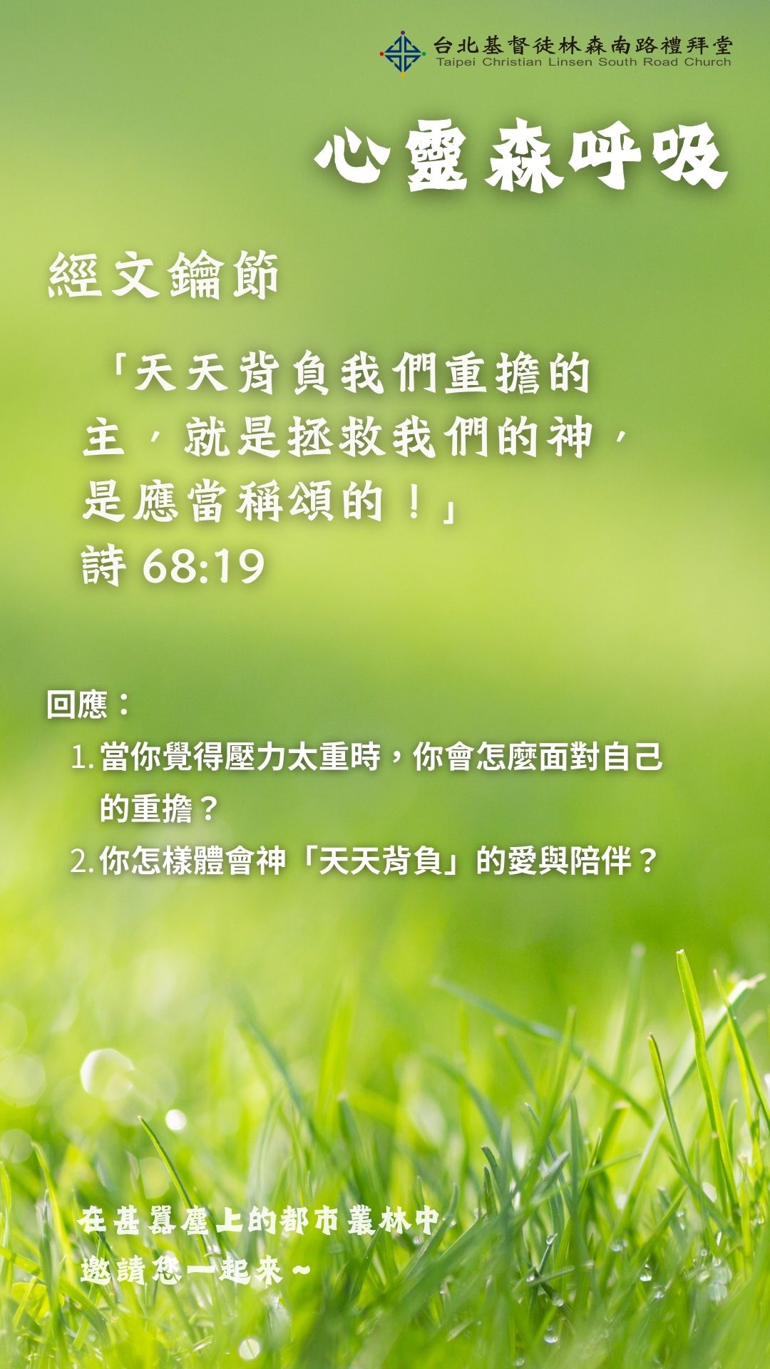 「天天背負我們重擔的主,就是拯救我們的神,是應當稱頌的!(細拉)神是為我們施行諸般救恩的神;人能脫離死亡是在乎主耶和華。」 詩篇68:19-20