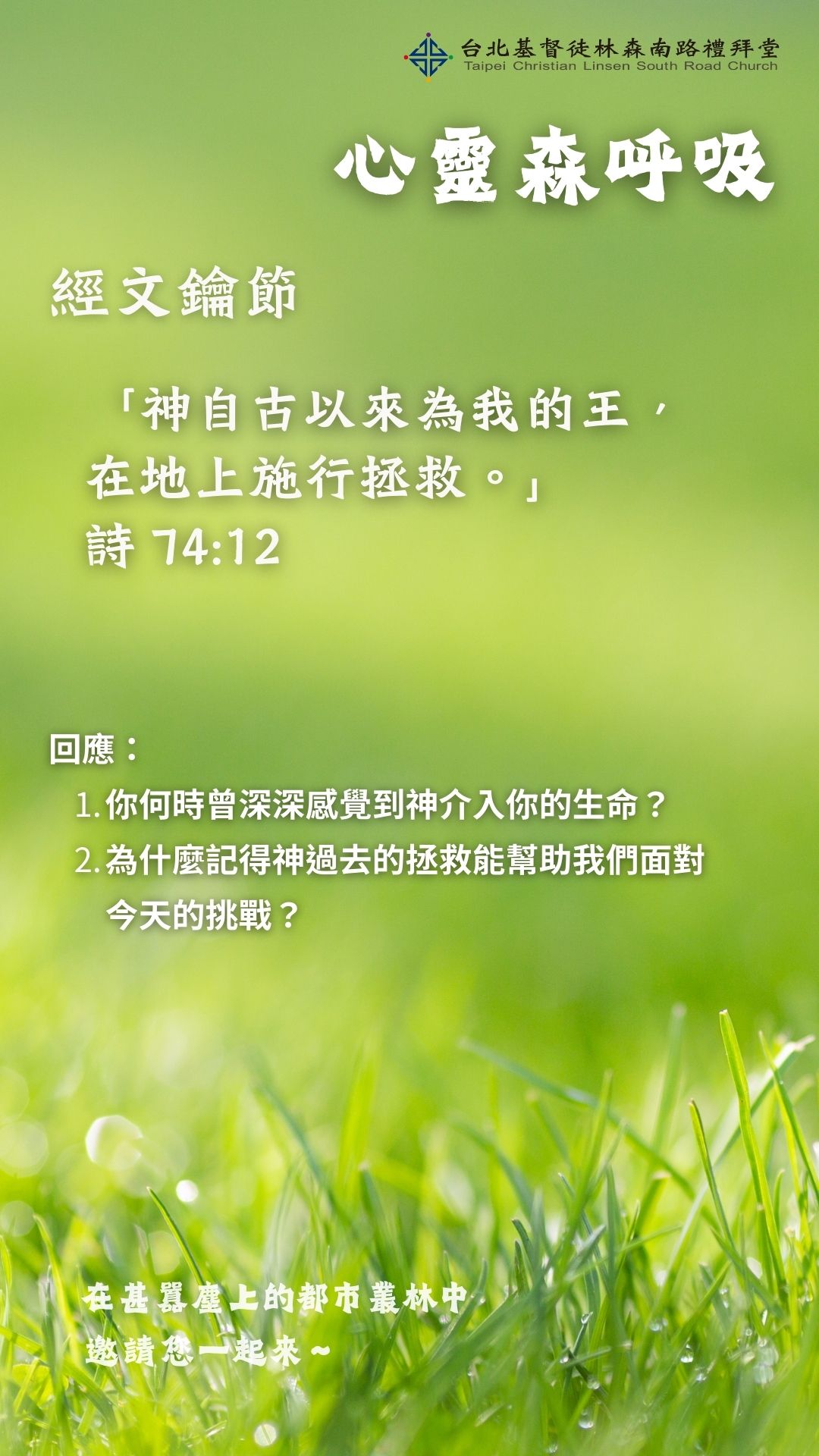 2. 鑰節:神自古以來為我的王,在地上施行拯救。(詩 74:12)