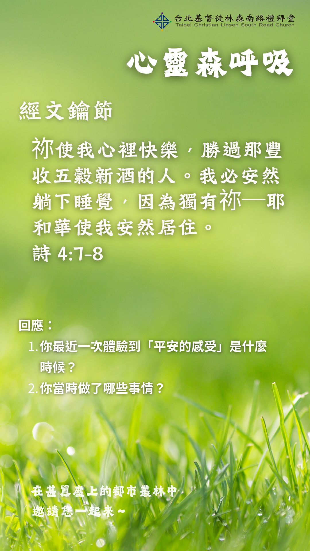 祢使我心裡快樂,勝過那豐收五穀新酒的人。我必安然躺下睡覺,因為獨有祢─耶和華使我安然居住。(詩4:7-8)