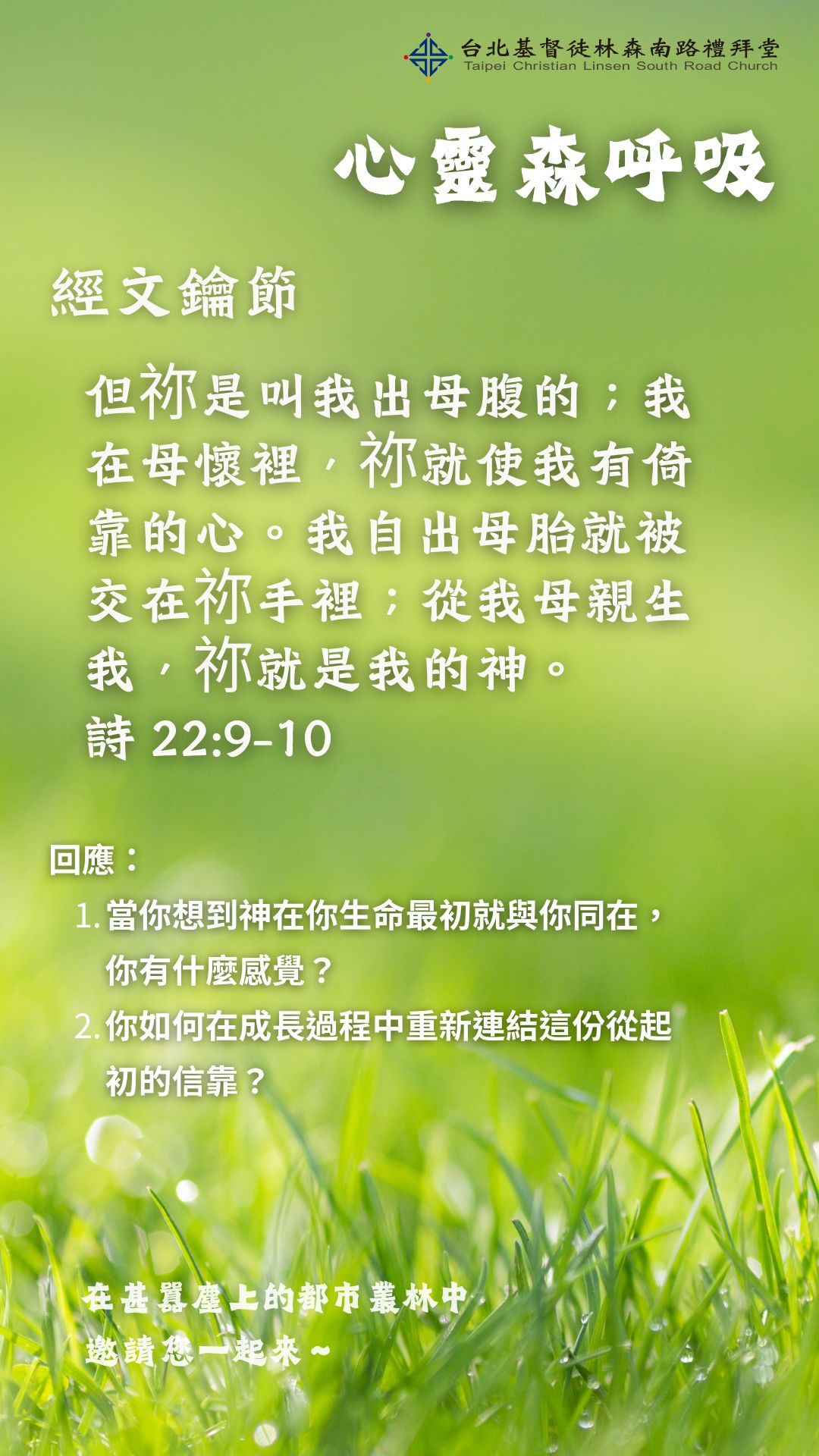 但祢是叫我出母腹的;我在母懷裡,祢就使我有倚靠的心。我自出母胎就被交在祢手裡;從我母親生我,祢就是我的神。(詩22:9-10)