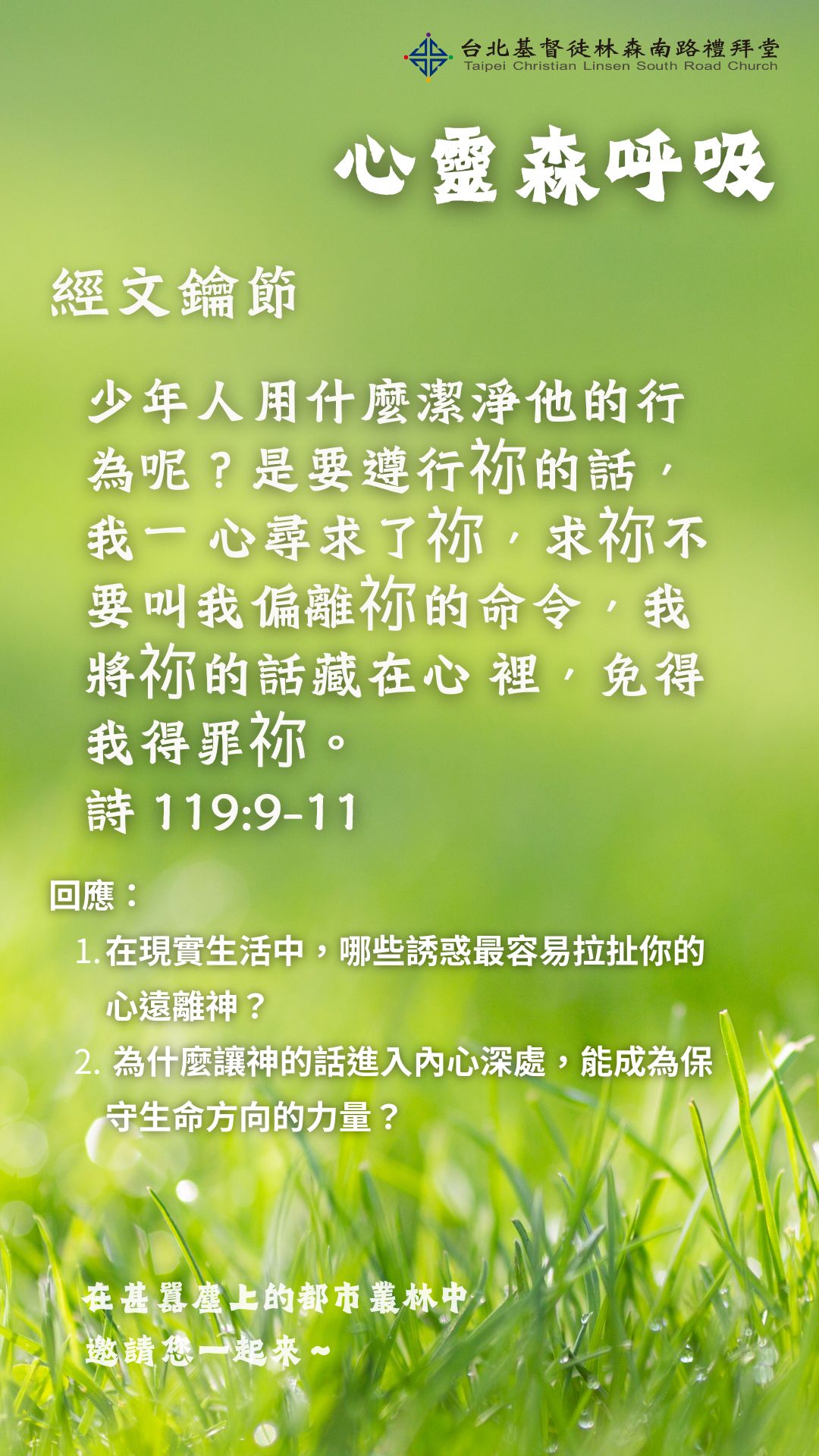 少年人用什麼潔淨他的行為呢?是要遵行祢的話,我一心尋求了祢,求祢不要叫我偏離祢的命令,我將祢的話藏在心裡,免得我得罪祢。(詩119:9-11)
